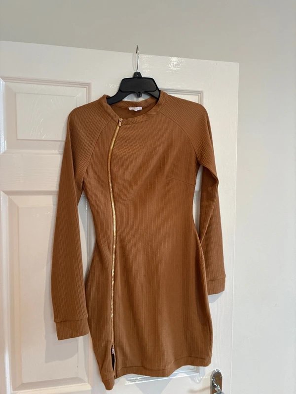 The Mistress Rocks Long Sleeve Zip Split Dress in Brown is available in sizes S.