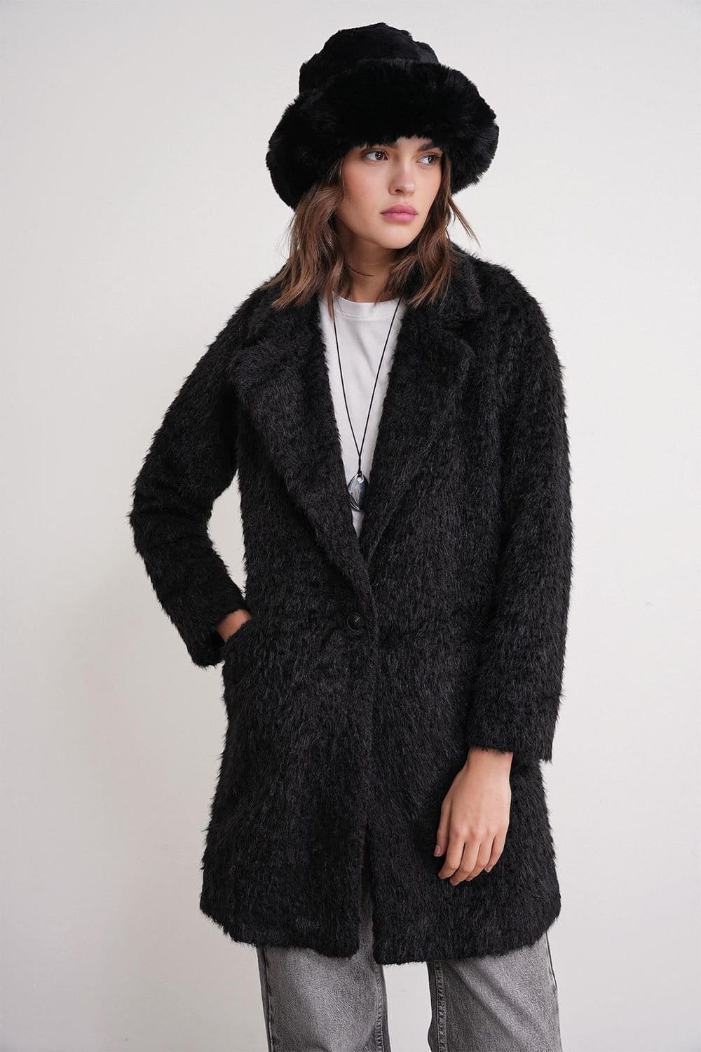 Elevate your casual style with our Textured Woven Long Overcoat. Crafted from high-quality polyester, this woman's overcoat combines comfort with sophistication. Featuring a classic jacket collar and long sleeves, it offers a regular fit that flatters your silhouette. The button closure adds a touch of elegance.