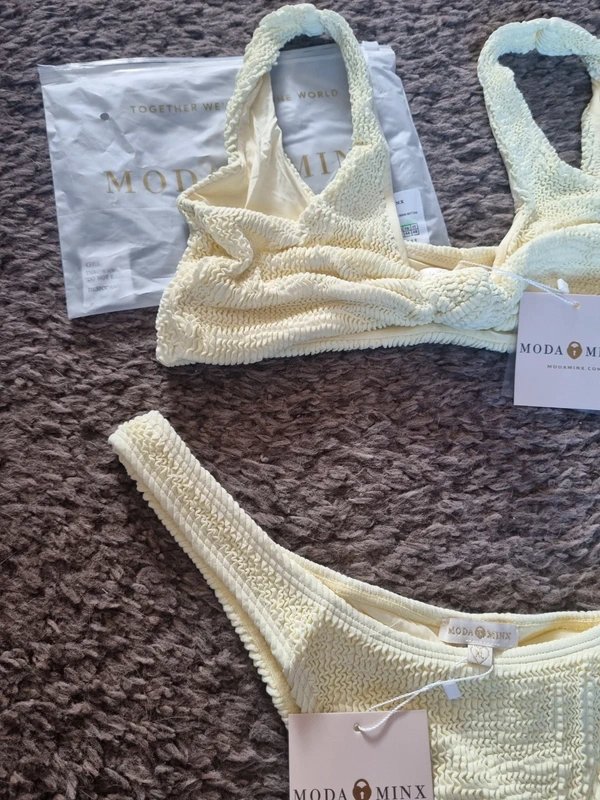 Serve effortless beach-club energy with this stunning lemon knot-front Brazilian bikini set from Moda Minx. Features a flattering knot-front top and Brazilian-cut bottoms for that sculpted, confident fit. Gorgeous textured fabric, super comfy, and perfect for holidays, spa days, or tanning sessions.