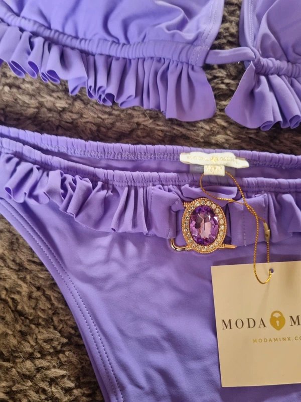 Turn heads this summer with this stunning lavender two-piece featuring luxe ruffled trim and gold & purple embellishments. The triangle halter top and tie-side bottoms offer adjustable comfort and a flattering fit.
