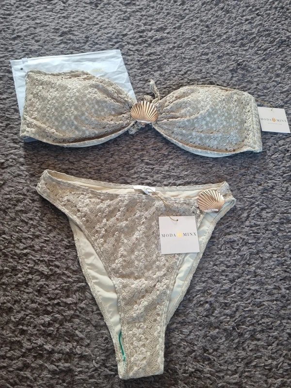 The Moda Minx Gold Lace Bandeau Bikini Set is available in sizes XXL.