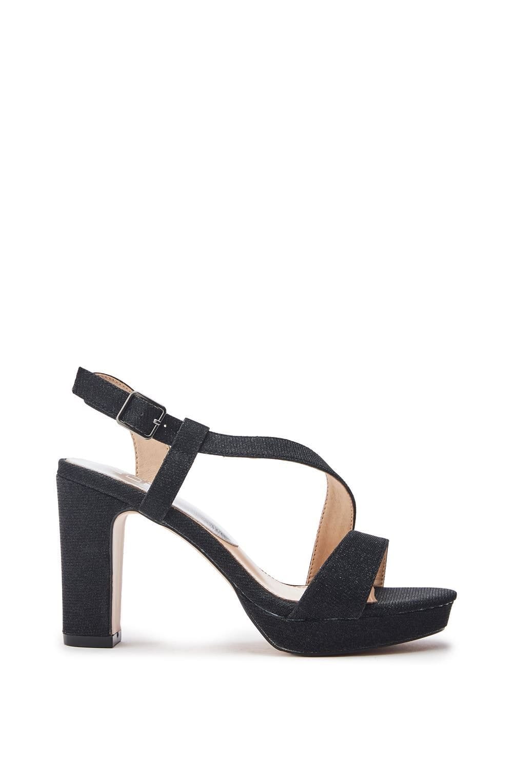 Stylish black textile heeled sandals by Moda In Pelle. Featuring an asymmetric strap design with crisscross pattern and glitz detailing. Perfect for adding a glamorous touch to any outfit.