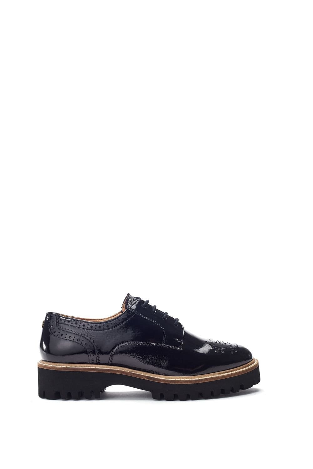 Elegant patent leather brogues in black with traditional brogue accents. The chunky sole offers on-trend style and comfort. The lace-up front ensures a secure fit, while the round toe adds a modern touch.