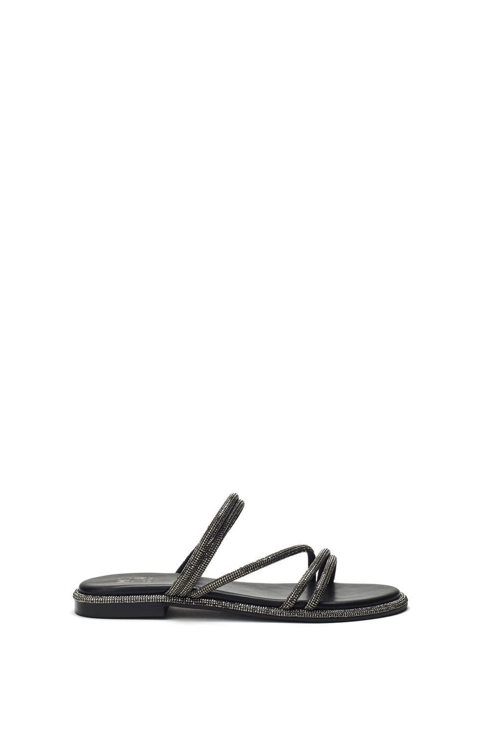 Sleek black Porvair sandals with a slip-on design and hot stone and jewel embellishments. Ideal for adding a touch of glamour to your summer outfits.
