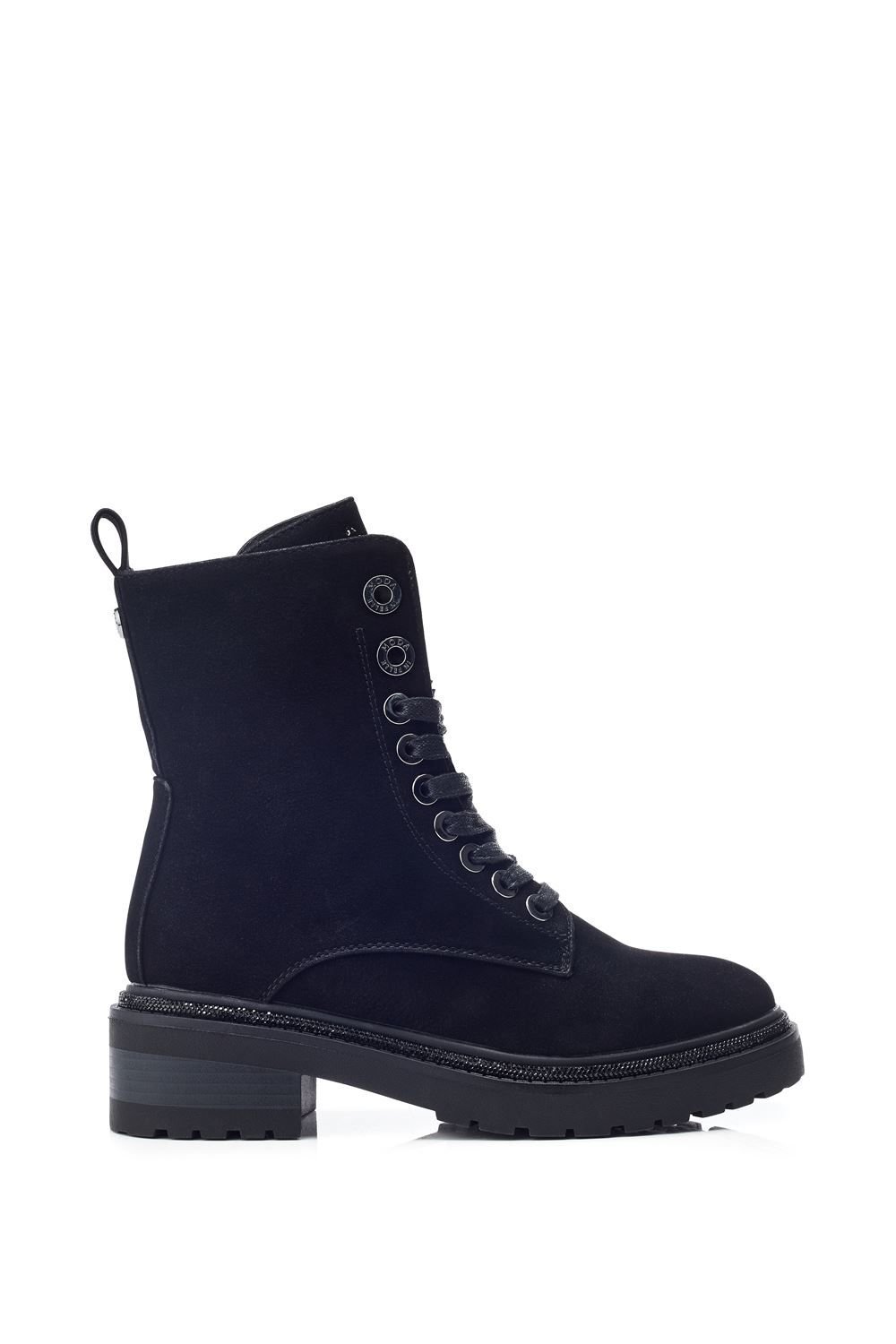 Glamorous ankle boots in black suede with a chunky rubber sole and laces for a perfect fit. Features glitz stones and a beaded motif tongue. Lined with faux fur for warmth.
