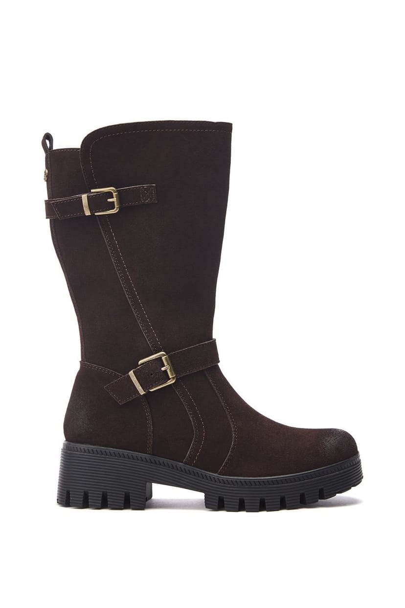 Chunky mid-calf boots in dark brown suede with a double buckle design. The added elastic panel provides extra stretch to the fit whilst the zip ensures easy foot entry. Perfect for the cooler months, featuring faux fur lining for extra warmth and a soft padded leather sock for comfort.