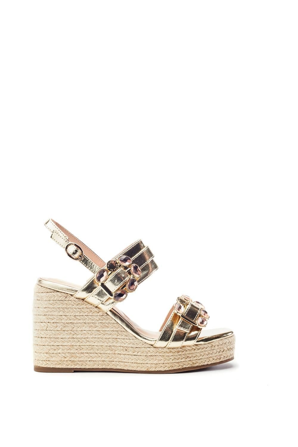Luxurious Moda In Pelle Moyra wedges in gold feature an in-house designed buckle adorned with semi-precious stones. The natural woven wedge heel provides height and stability, while the leather lining and padded sock ensure comfort for all-day wear.
