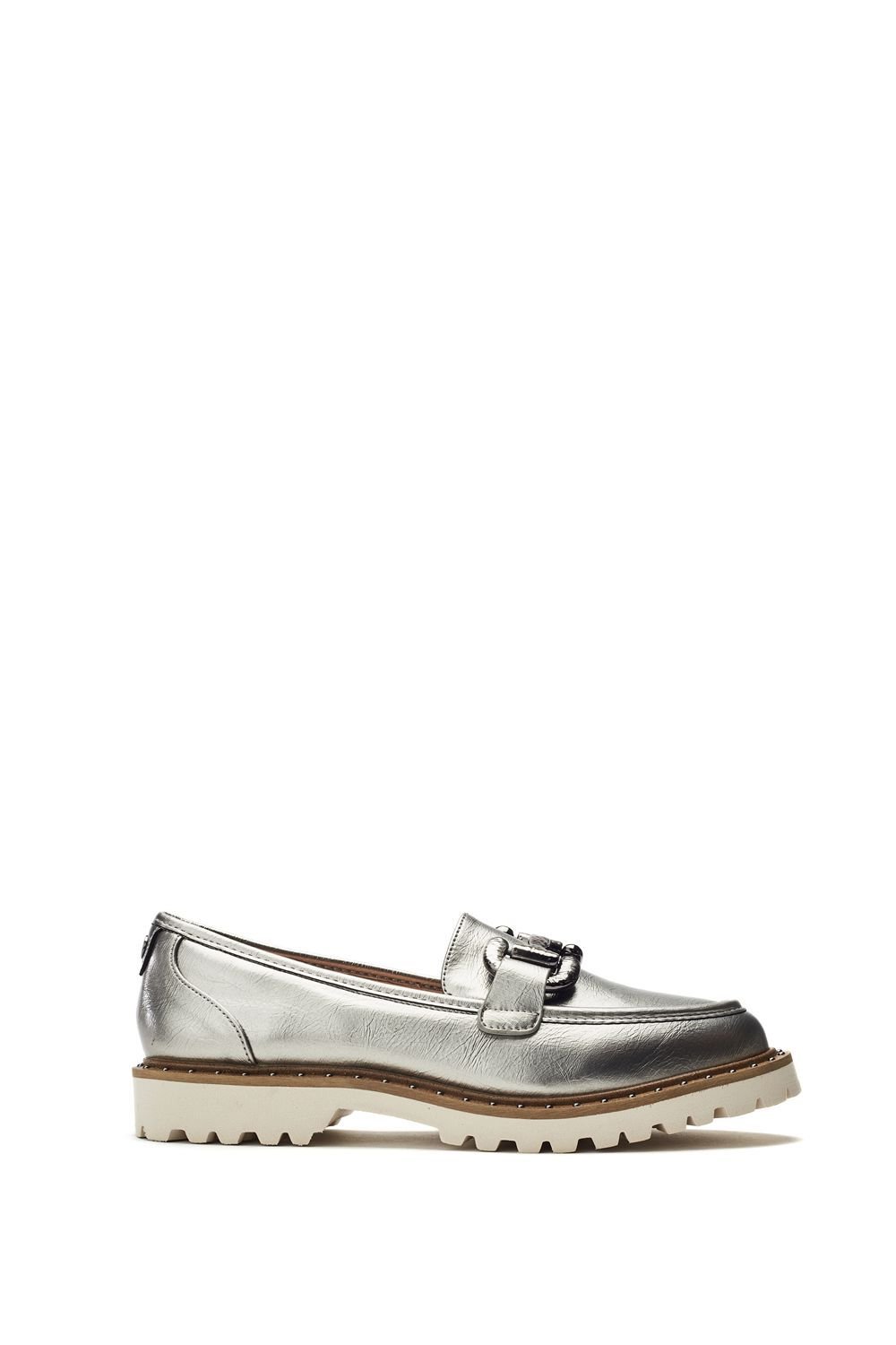 Elegant metallic silver loafers by Moda In Pelle with a signature snaffle trim. The cleated sole offers durability, making them perfect for everyday wear.