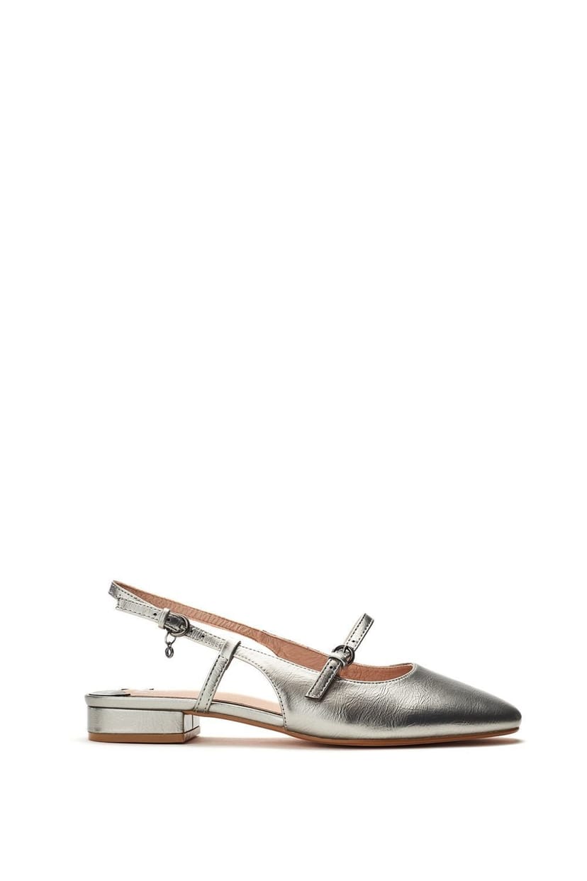 Timeless slingback Mary Jane in metallic silver with a sleek rounded toe. The slingback strap offers a secure and customisable fit. Perfect for both dressy and casual outfits.