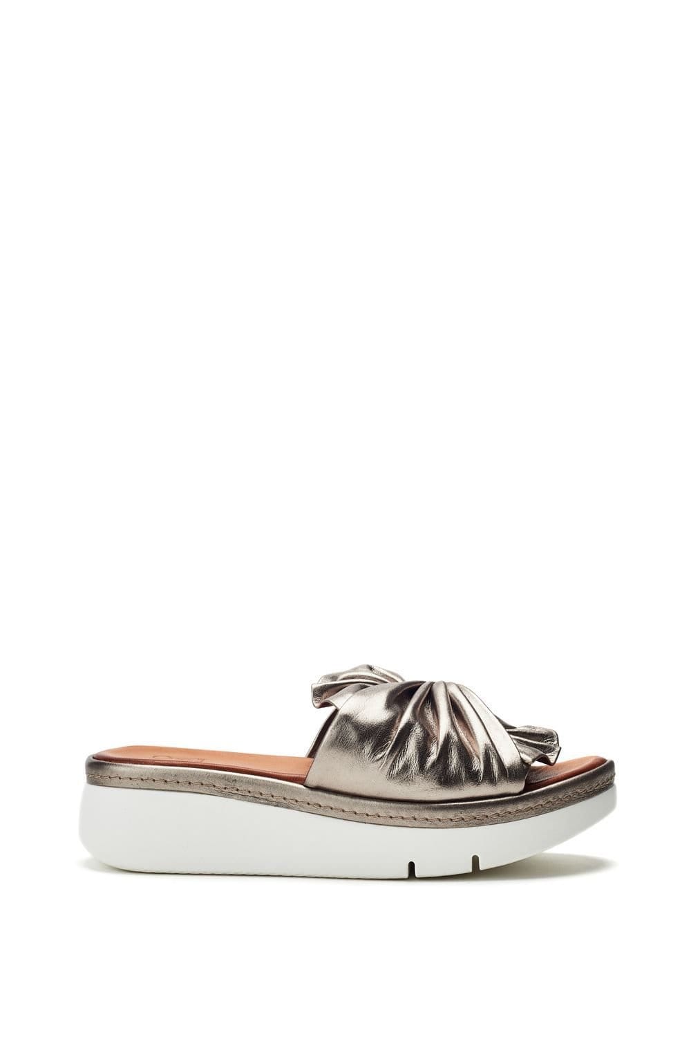 Stylish metallic silver leather flatform sandals with a twist upper detail and bow-like accent. The small wedge heel adds height while remaining comfortable for all-day wear.