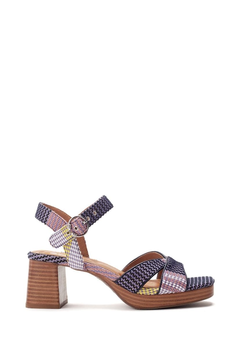 Stylish Moda In Pelle navy textile heeled sandals with soft leather-bound edges for comfort. The platform sole adds height and stability, perfect for all-day wear. Ideal for both casual and dressy occasions.