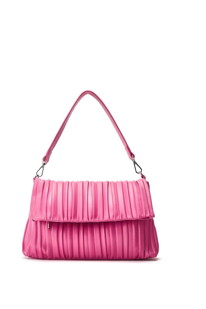 This pink leather clutch bag by Moda In Pelle features a pleated design for a refined yet modern look. It can be worn over the shoulder or cross-body with an adjustable strap. Perfect for carrying all your essentials.