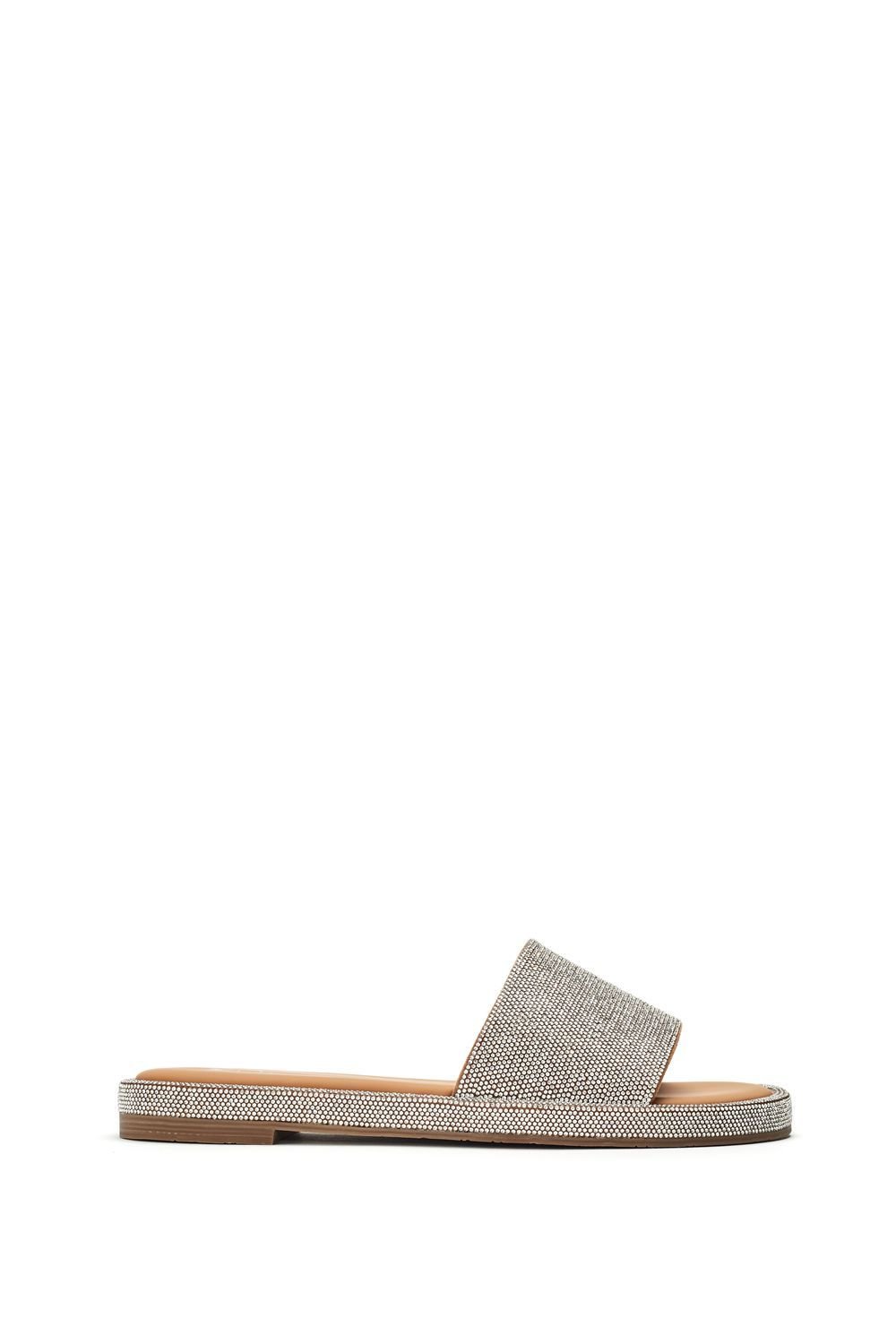 Glamorous slip-on sandals in metallic silver with a textured beaded pattern. Featuring a leather sock for comfort, these versatile sandals are perfect for transitioning from casual to evening wear.