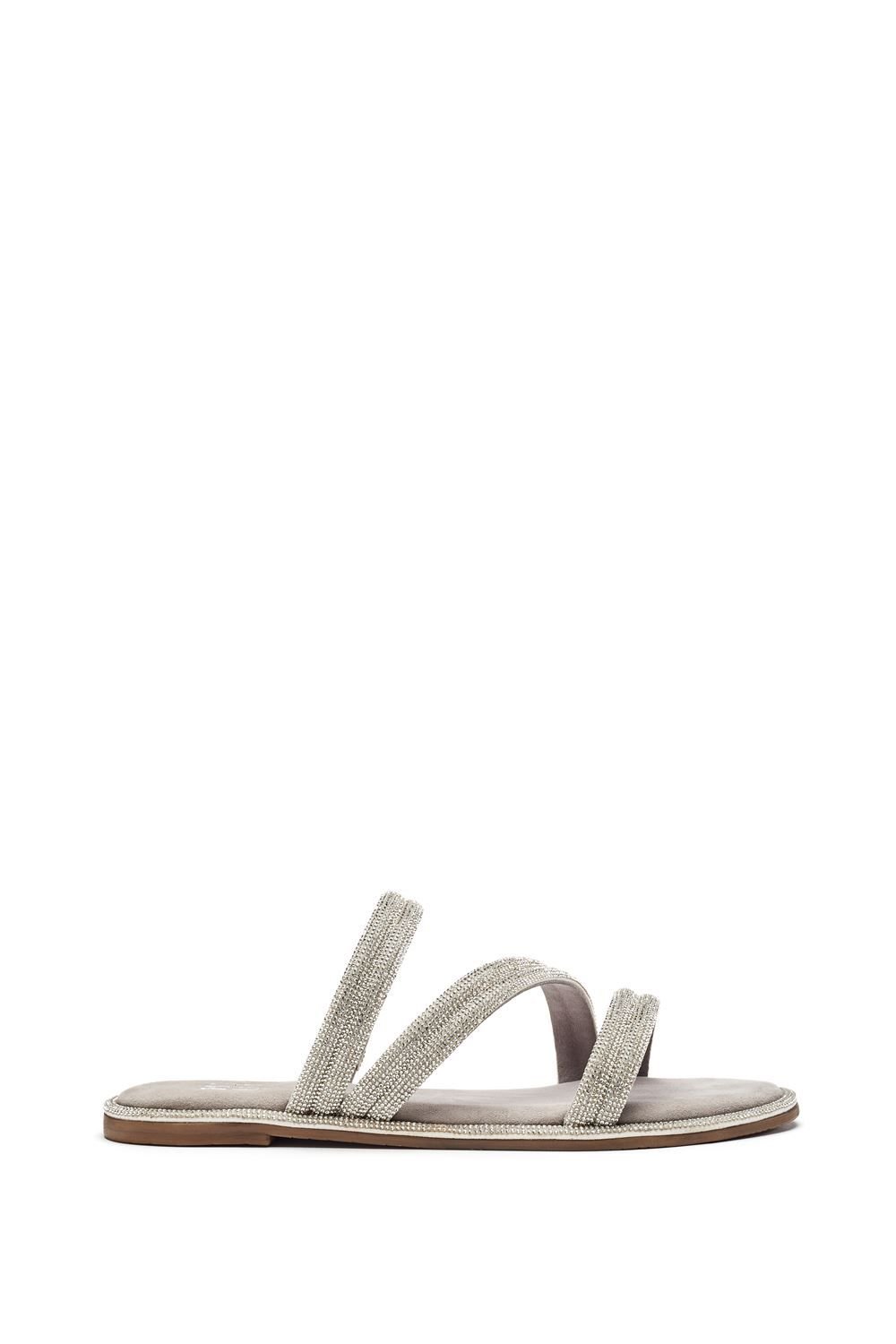 Glamorous flat sandals with glitter embellishments and a suede-like upper. Perfect for adding a touch of sparkle to your summer outfits.