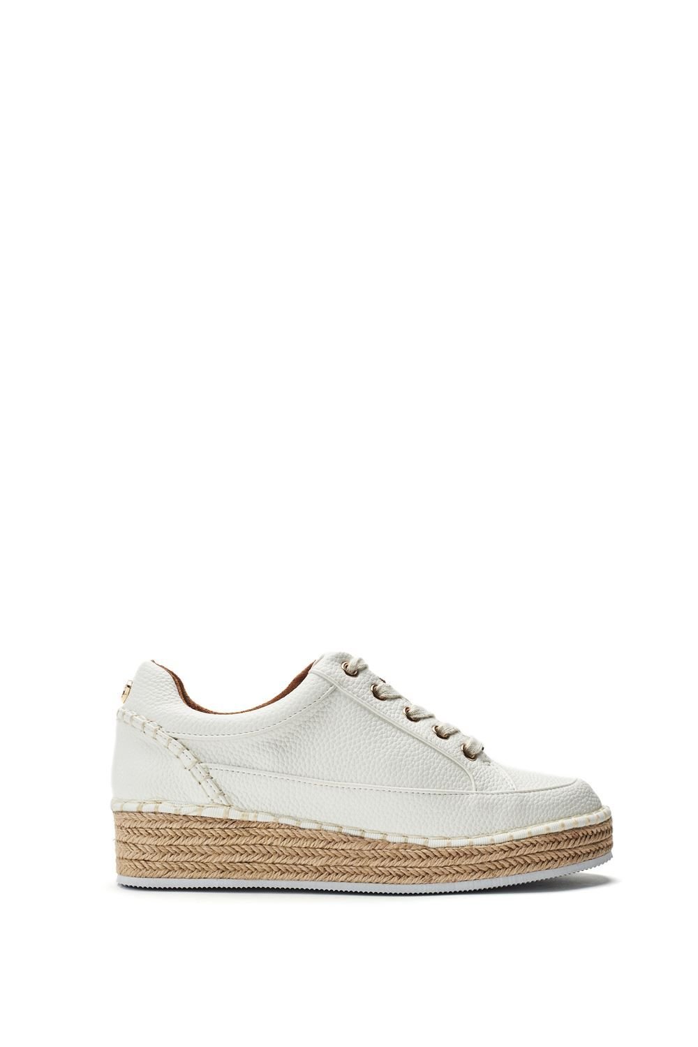 The Moda In Pelle White Leather Trainers with Jute Heel is available in sizes 3, 4, 5, 6, 7, 8.