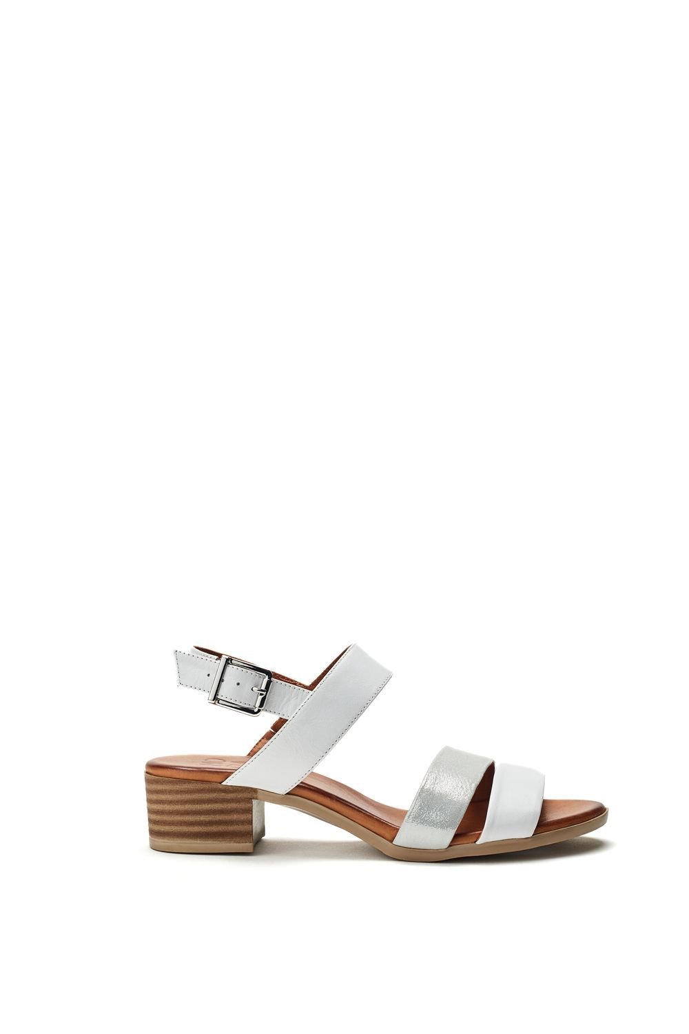 Stylish Moda In Pelle sandals in white leather with a unique twin strap design. The low block heel offers comfort and support for all-day wear. Perfect for pairing with dresses, skirts, or trousers.