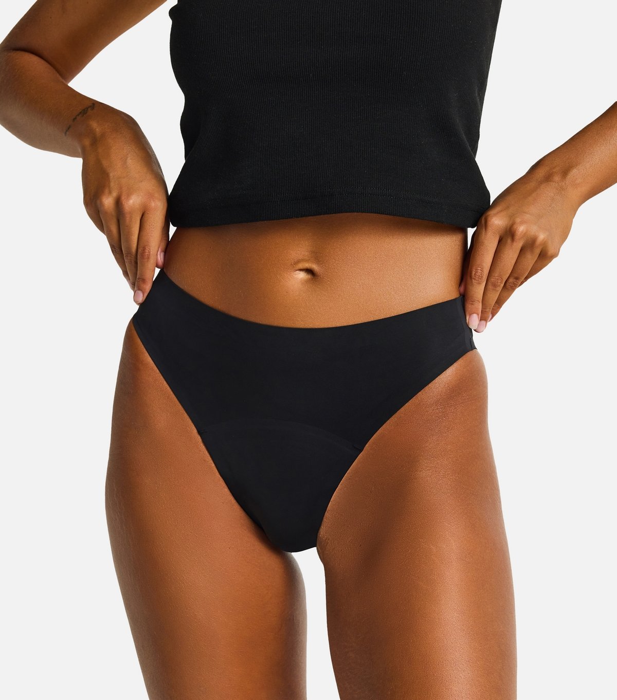 Comfortable and stylish black jersey briefs designed for light-flow period days. Featuring a high-leg and Brazilian cut, these briefs offer protection while fitting like regular underwear.