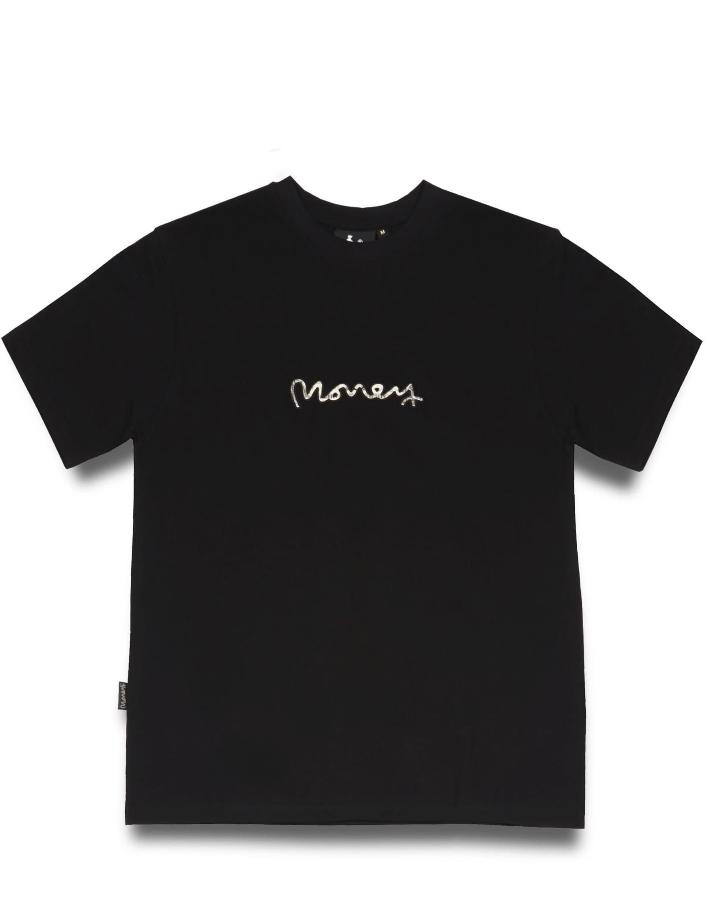 Stylish black cotton tee from Money Men featuring a Box Money Script logo and Real Money Stitch details. Perfect for a casual, streetwear look.