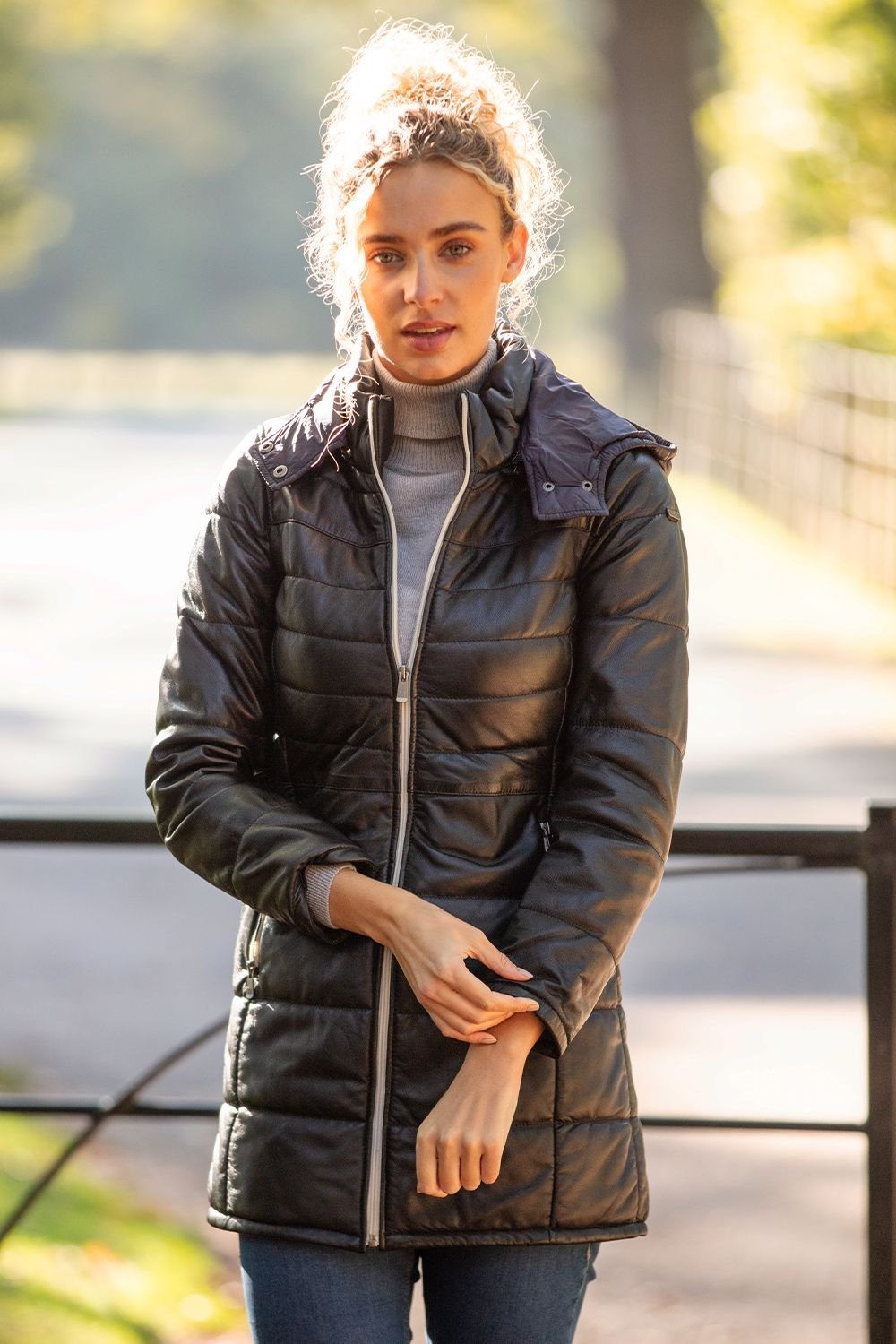 Stylish Monomoi jacket crafted from 100% genuine leather. Features a detachable hood, zip closure, and stitch detailing. Ideal for all weather with its padded interior for warmth.