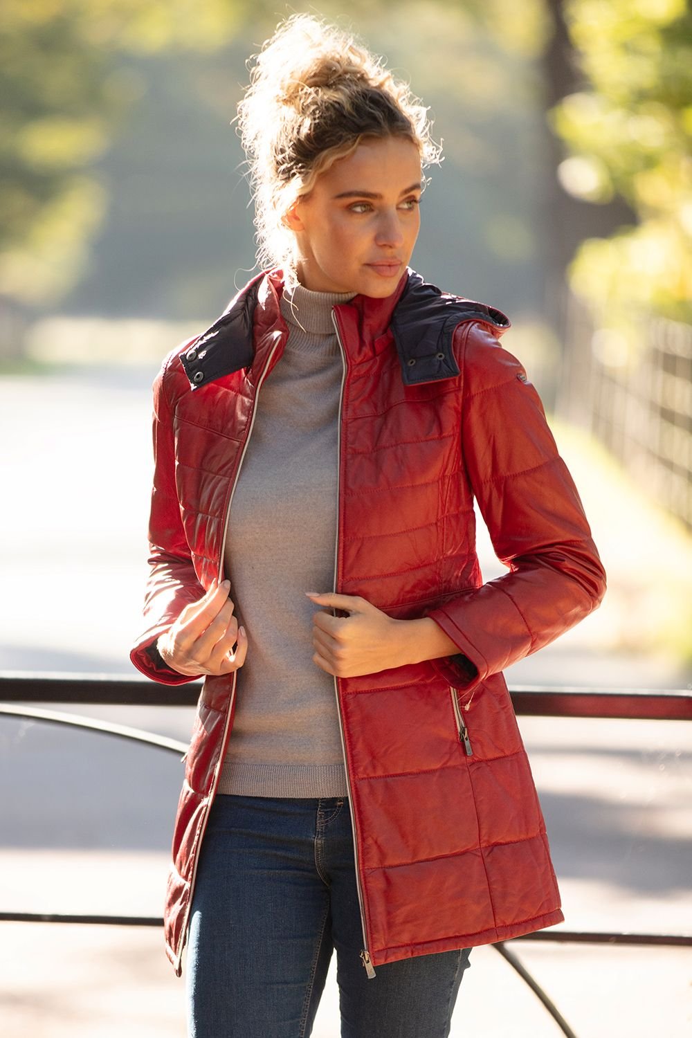 Stylish red leather jacket with a detachable hood, perfect for all weather. Features a zip closure, stitch detailing, and full lining for comfort. Ideal for casual and smart-casual looks.