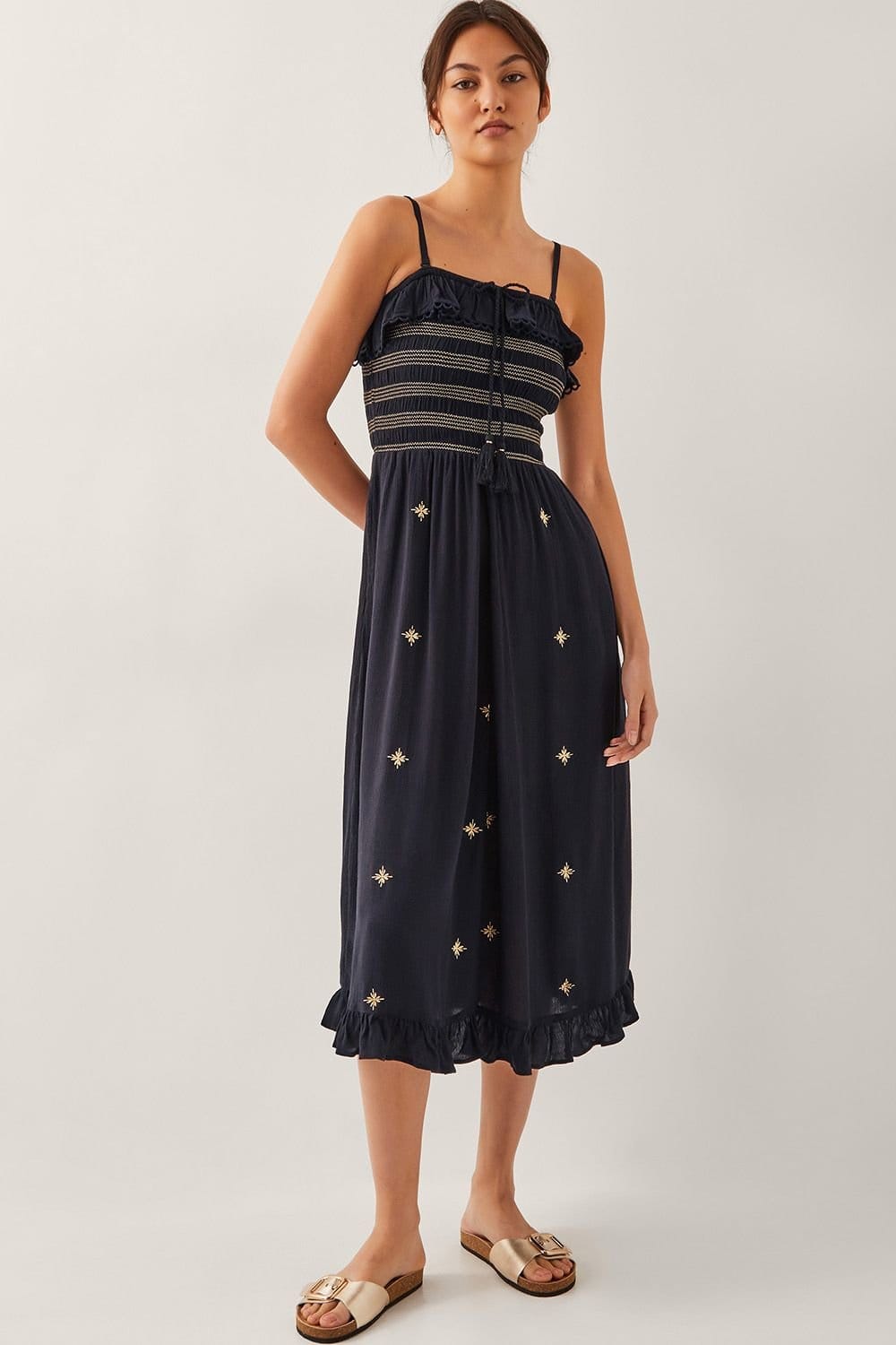 This black midi dress by Monsoon features a shirred bodice and a column skirt with ruffled detailing and intricate embroidery. Perfect for a relaxed yet elegant look.