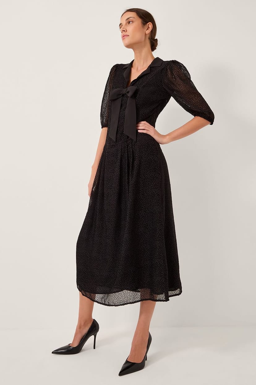 The Monsoon Black Velvet Polka Dot Midi Dress is ideal for evening, date-night, party.
