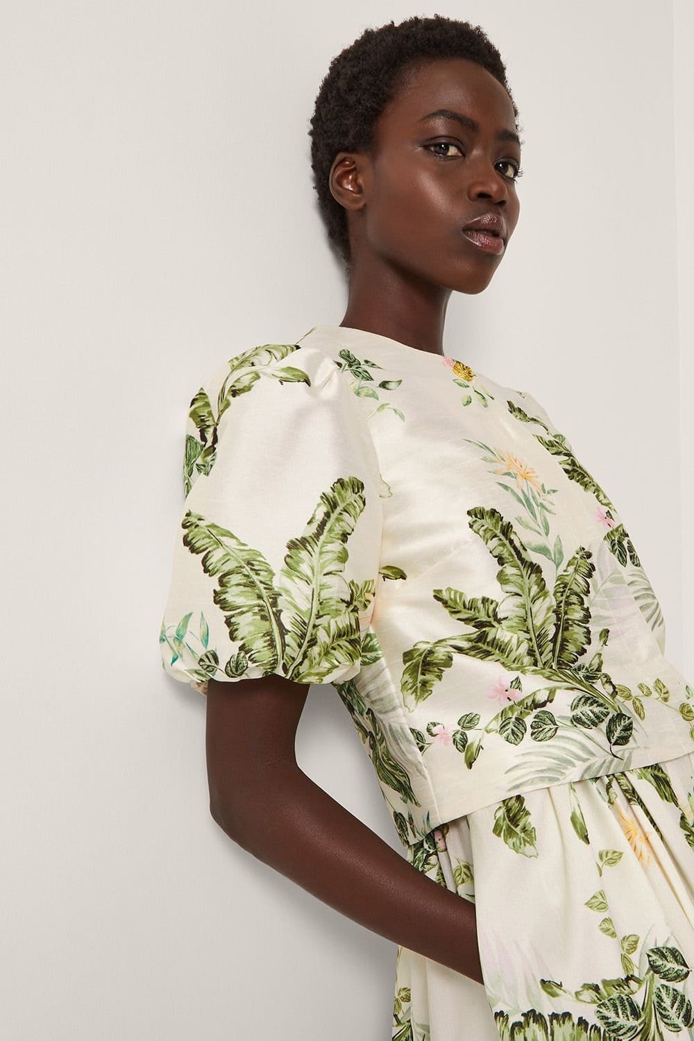 Elegant cream puff sleeve jacket adorned with tropical leafy florals. Ideal for covering shoulders at special occasions, this piece features a gold-tone molten button at the neckline.