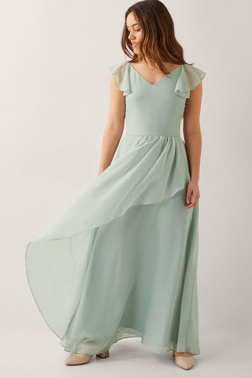 The Monsoon Green Chiffon V-Neck Prom Dress is available in sizes 15 YEARS.