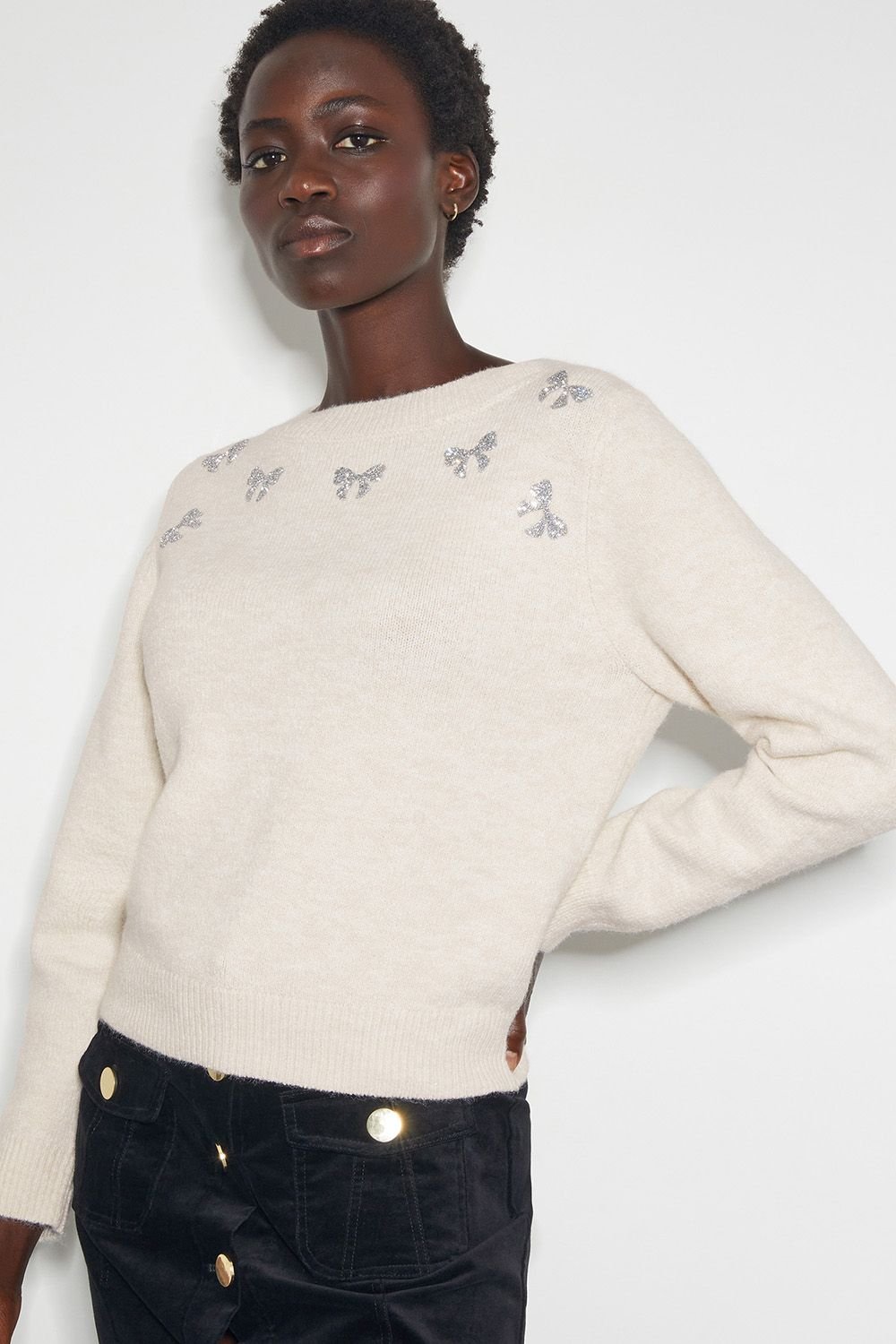 This ivory jumper features a glittery bow motif around the neckline, adding a touch of glam. Made from a soft, warm fabric, it's perfect for casual wear.