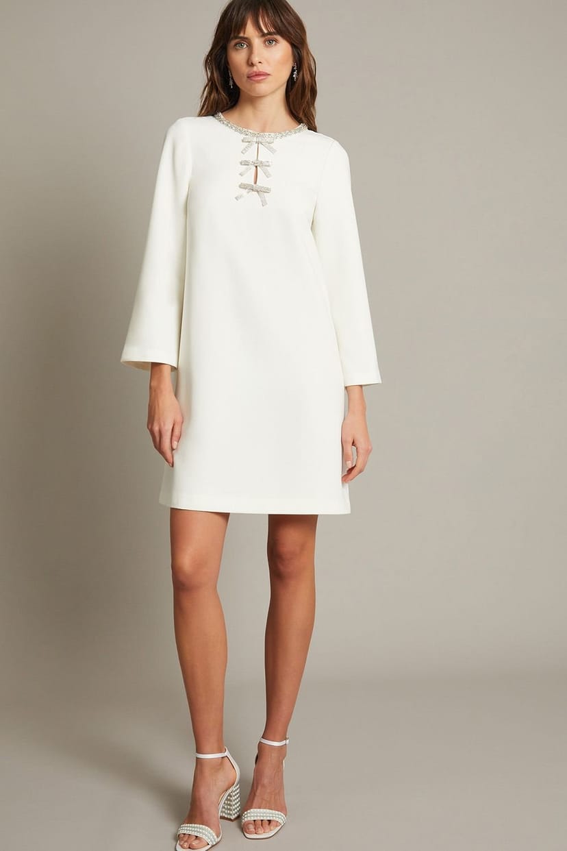 Elegant Ivory shift dress with long sleeves and a high neck. Adorned with diamante bows and an embellished collar, perfect for a modern-day wedding.
