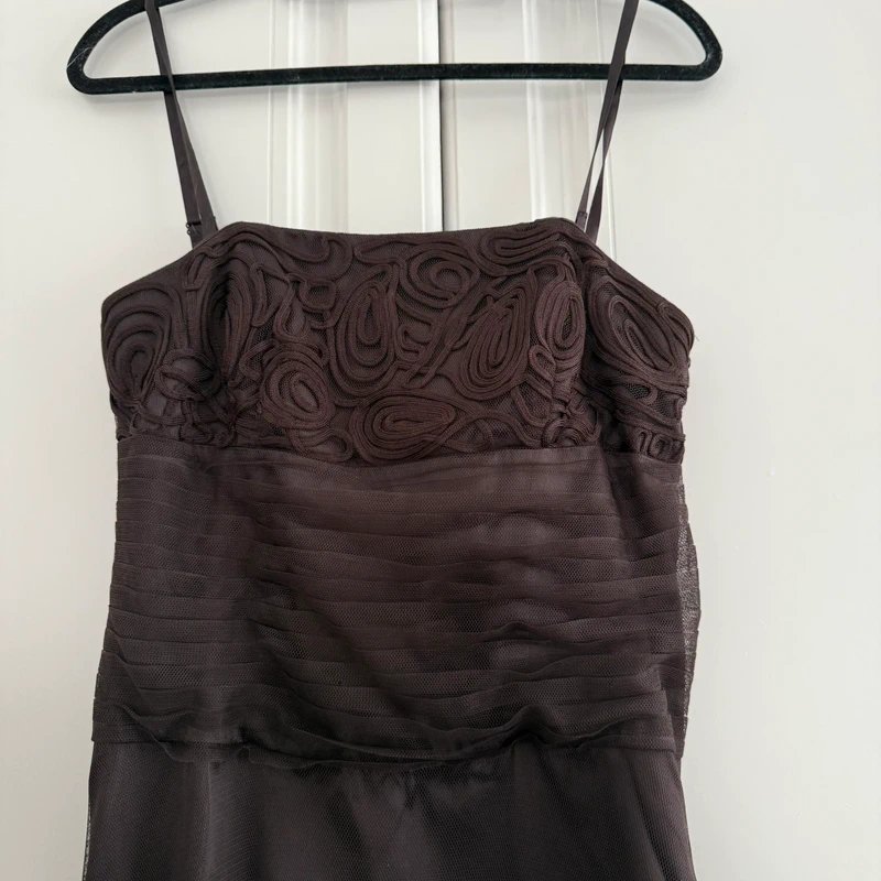 Rich chocolate brown/taupe colour Strappy bodice with intricate satin/swirl detail Fitted waist Perfect for a wedding guest, prom, ball, Christmas party, New Year's Eve, or formal event