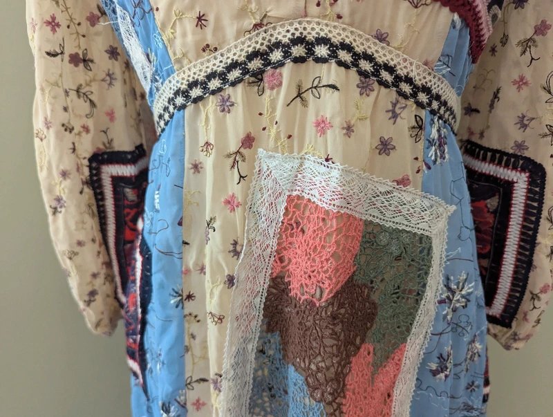Stunning embroidered patchwork midi dress from Monsoon. Designed in beige and pale blue, this A-line dress features embroidered floral details and lace accents. Crafted from lightweight chiffon, it offers a floaty and airy feel. Perfect for festivals, boho events, and casual outings.