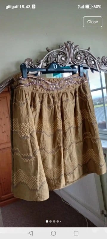 View Vinted's returns policyThis khaki shimmer embroidered skirt by Monsoon features a jewel waist with embellished side button detail. The skirt has a textured fabric with intricate embroidery and sequin accents. Ideal for spring and summer occasions.