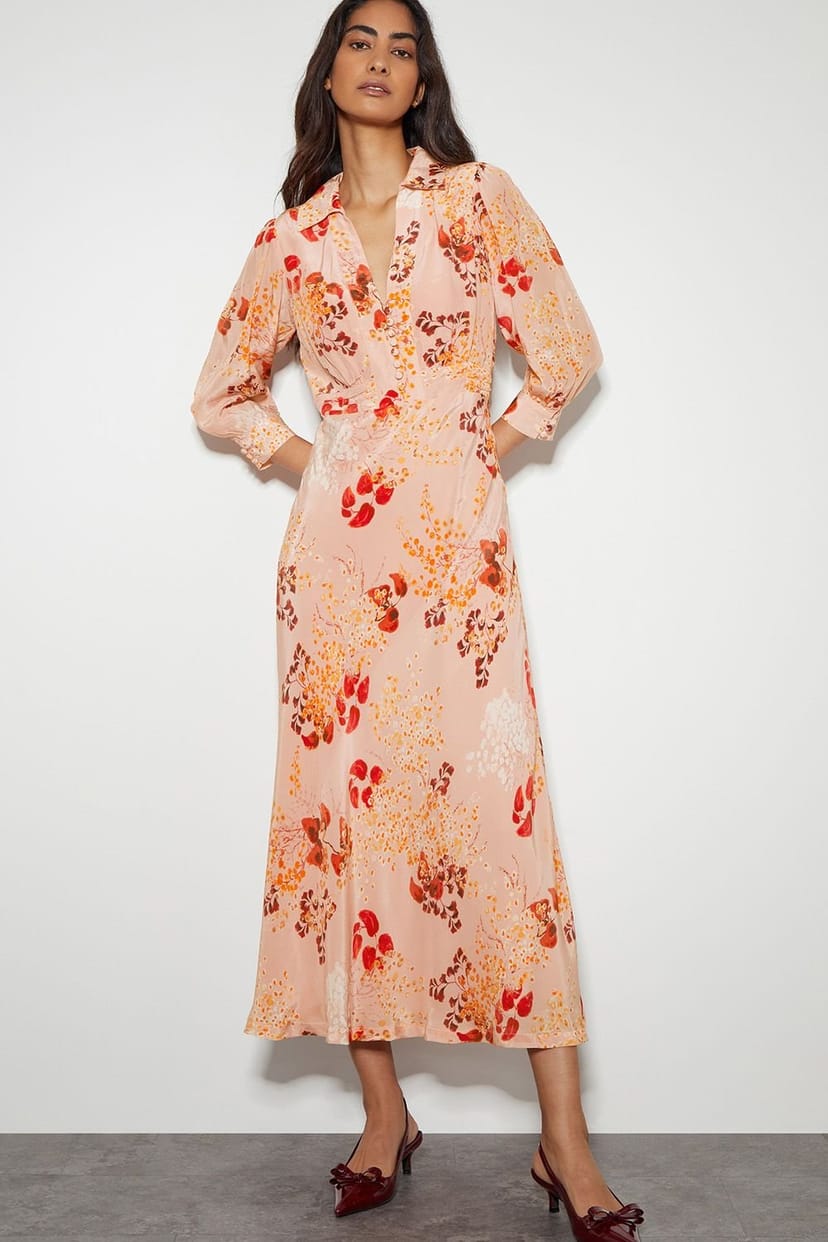 Charming pink floral shirt dress with a tea silhouette, hugging the empire line before flowing into a midi skirt. Crafted from a light and breezy fabric, it features a button-through fastening and cuffed sleeves. Ideal for sunny days.
