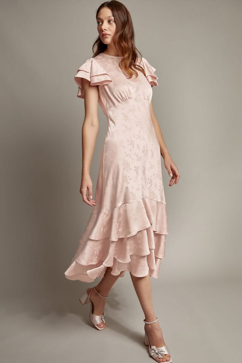The Monsoon Pink Satin Ruffle Midi Dress is available in sizes 14, 16, 22.