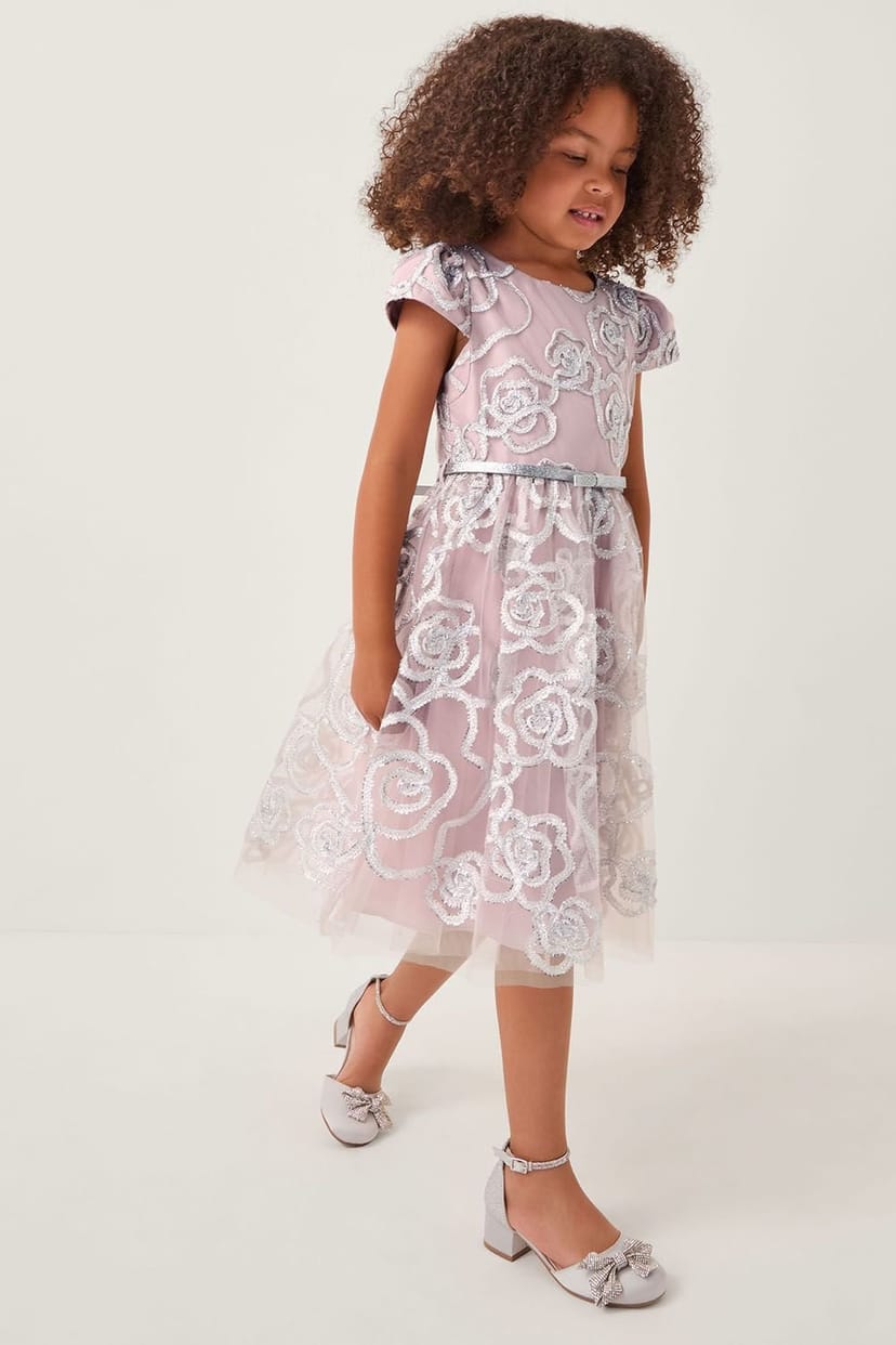 A dazzling pink tinsel party dress for girls, perfect for any special occasion. Featuring short sleeves and a swishy tulle skirt adorned with rose-shaped tinsel for an ultra-sparkly feel. The dress has a back zip fastening and a silver waist belt.