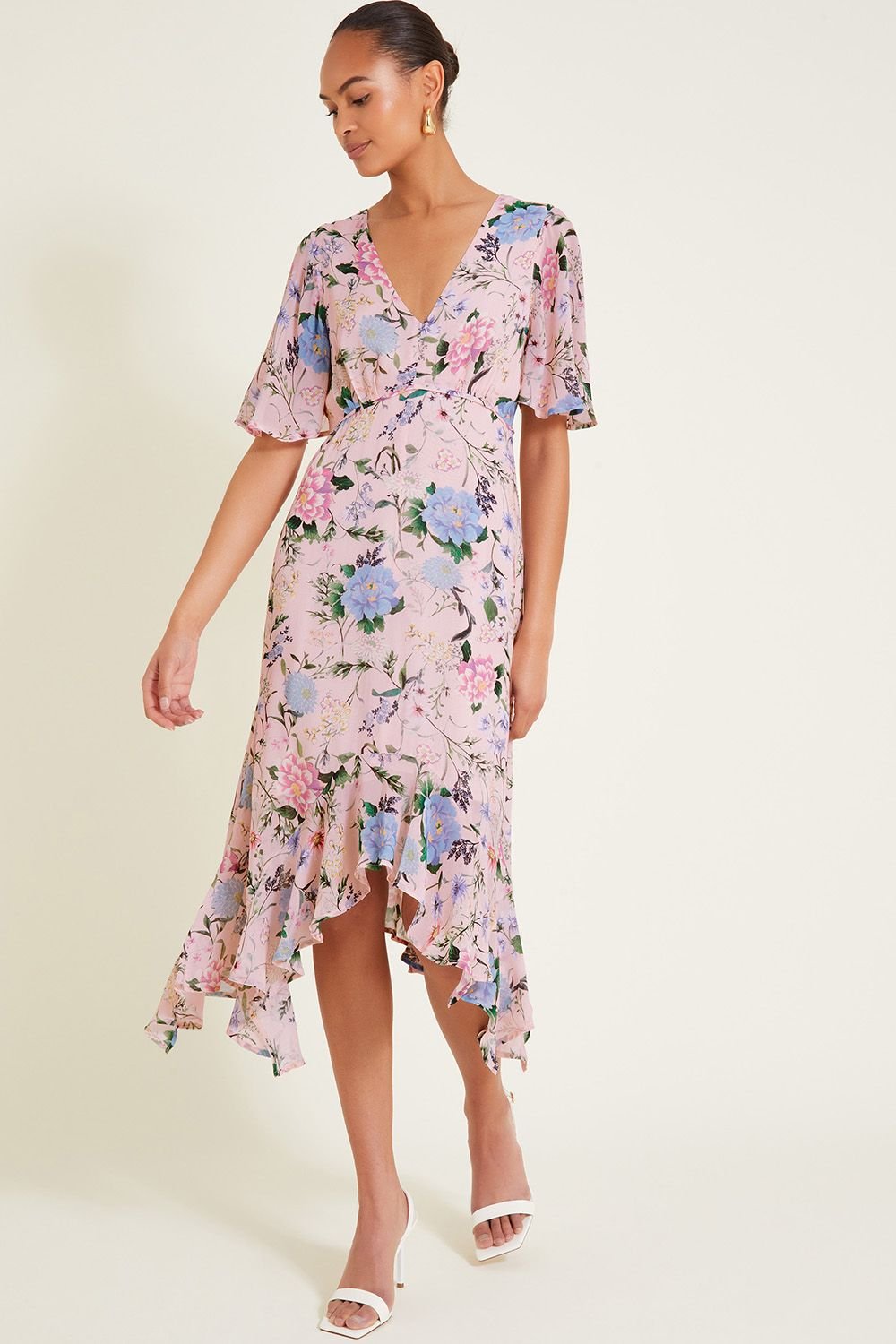 The Monsoon Pink Floral Print Midi Dress is available in sizes 8.