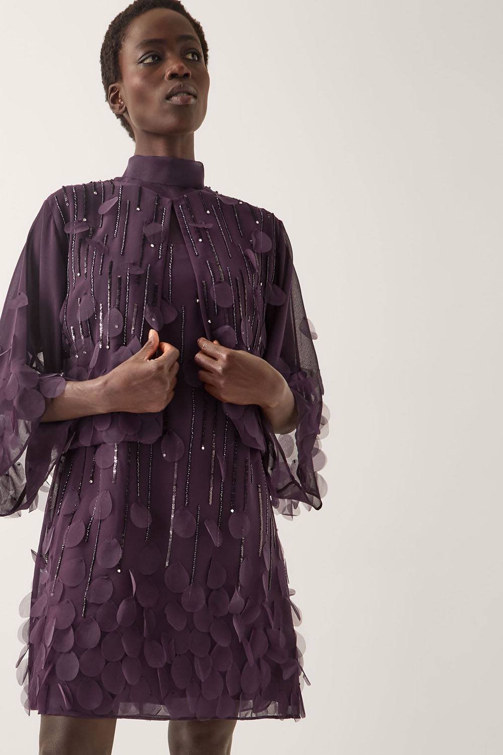 Make a statement with this purple chiffon jacket, embellished with sparkly sequins and appliqué chiffon circles. Designed with floaty sleeves, it adds a touch of glamour to your winter wardrobe.