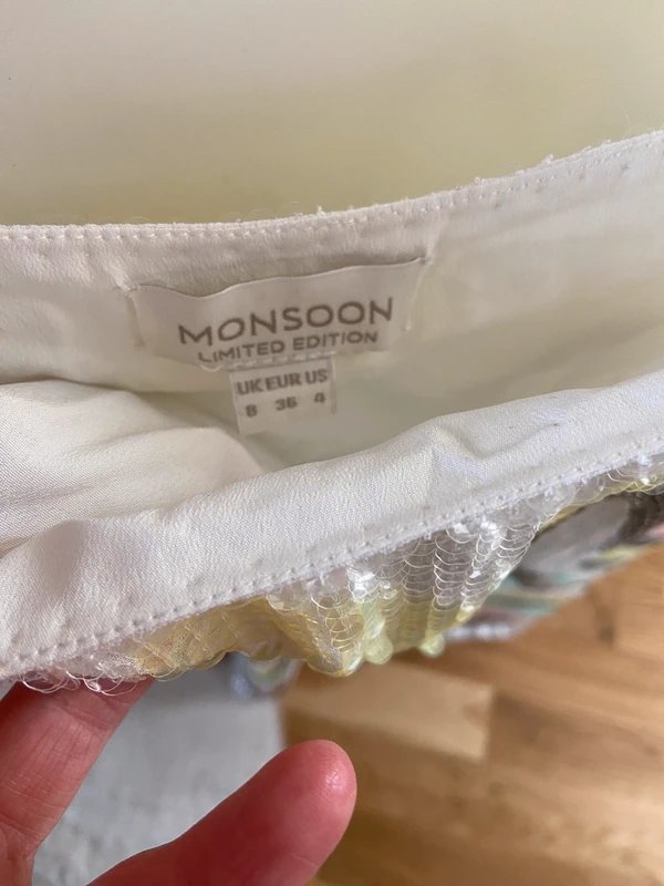 A stunning fully beaded Monsoon dress, featuring strappy design and embellished details. Perfect for a glamorous evening or special occasion.