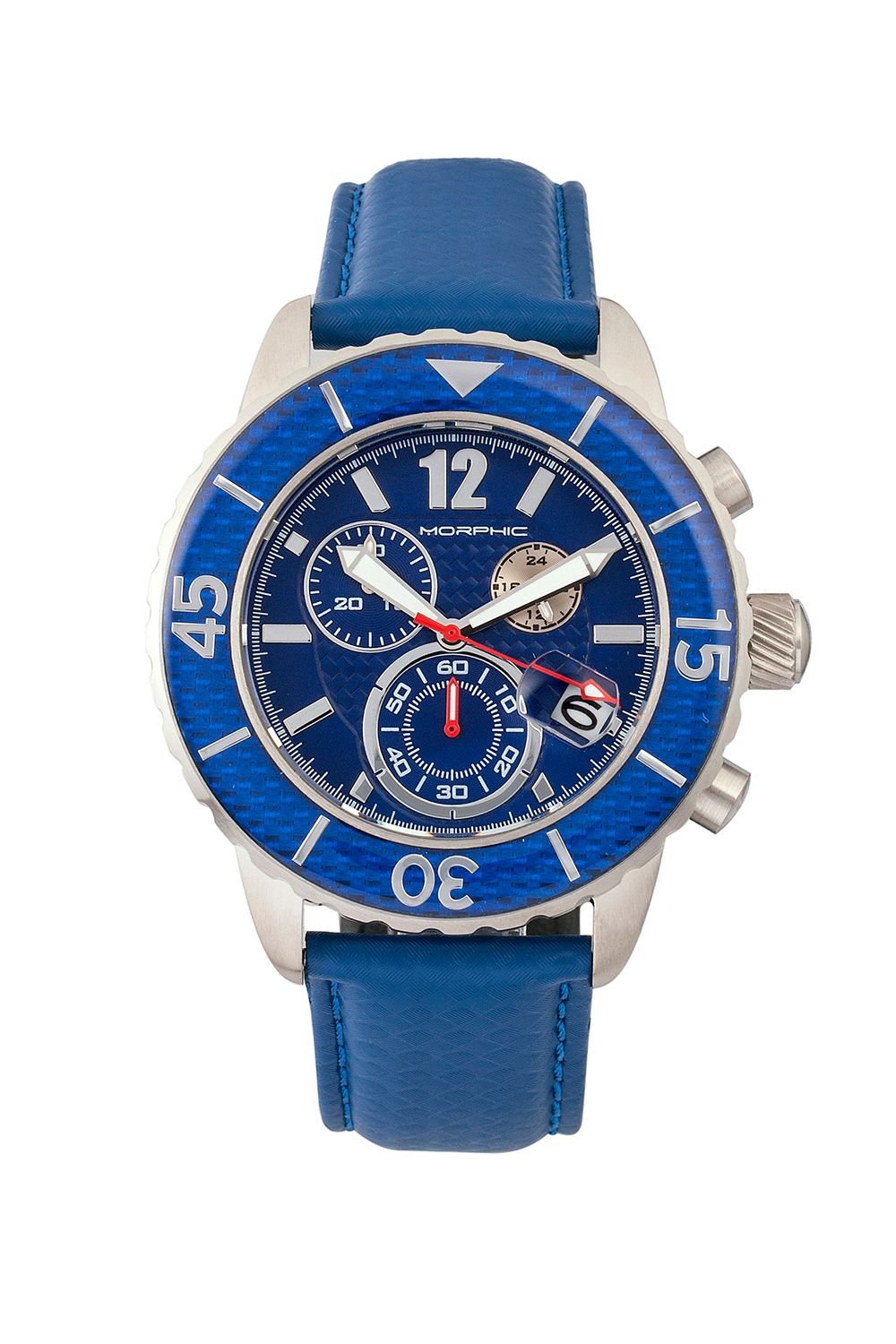 Stylish Morphic M51 Series watch in blue with a leather band. Features a 316L surgical-quality stainless steel case, quartz movement, and a full-function chronograph. The carbon fiber pattern dial adds a modern touch.