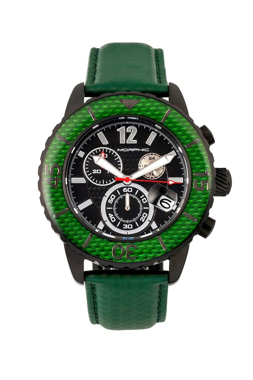 Stylish Morphic M51 Series watch with a green leather band, black dial, and carbon fiber pattern. Features a full-function chronograph and quartz movement for accuracy.
