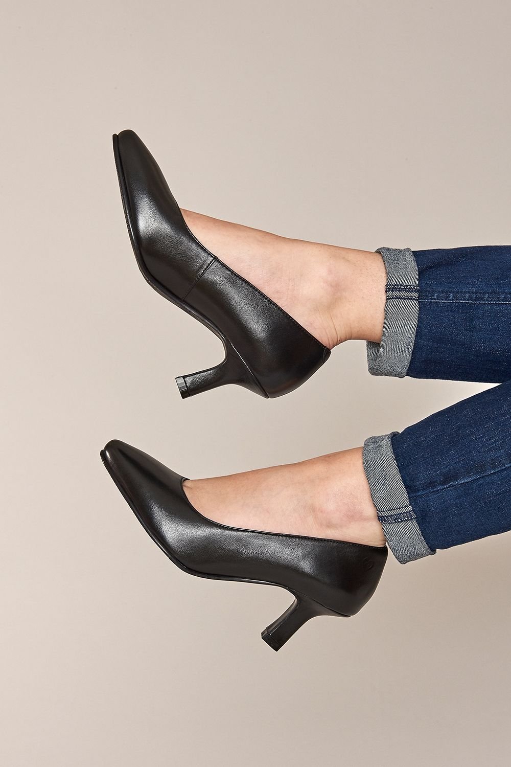 Elegant heeled court shoes in black featuring a pointed toe and cushioned heel. Crafted from soft leather for all-day comfort, perfect for both work and special occasions.
