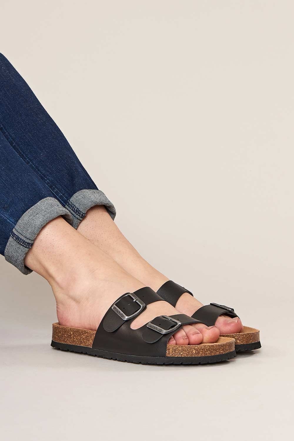 Stylish black leather mule sandals with a contoured cork footbed for all-day comfort. The lightweight sole and adjustable buckles add to the practicality and ease of wear.
