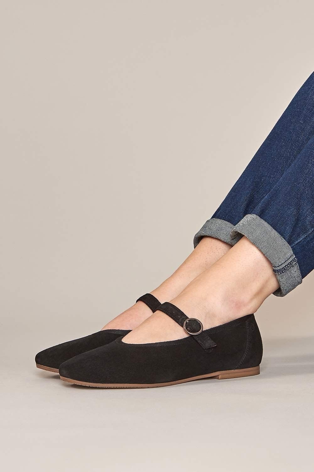 Elegant black suede ballerina pump from Moshulu. Features a squared toe, adjustable buckle, and a cushioned sole for all-day comfort. Perfect for both casual and special occasions.