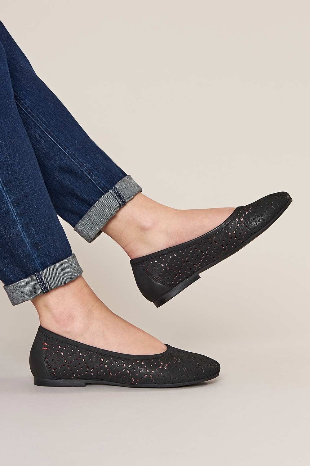 Stylish and comfortable black leather ballerina pumps with a punched pattern. Perfect for work, events, or casual outings.