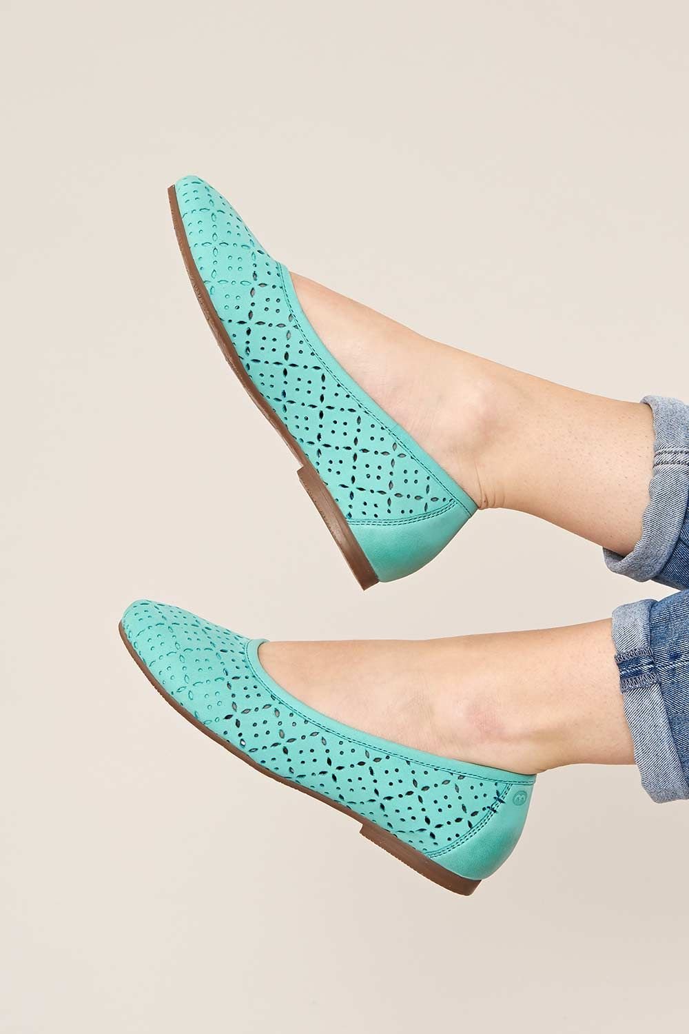 Stylish and comfortable bright blue ballerina pumps by Moshulu. Crafted from buttery-soft nubuck or metallic leather, these shoes feature a chic punched pattern and smooth leather linings. Ideal for work, events, or casual outings.