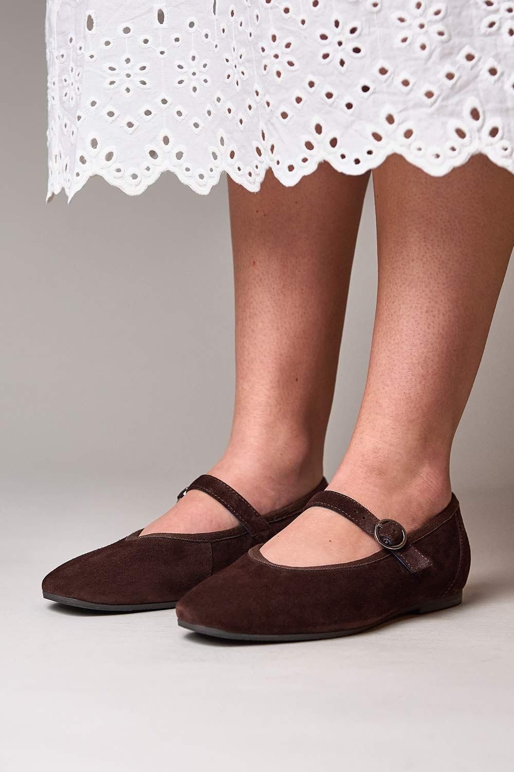 Elegant brown leather ballerina pump from Moshulu. Features a squared toe for comfort, an adjustable buckle, and a cushioned flexible sole. Ideal for both casual and special occasions.