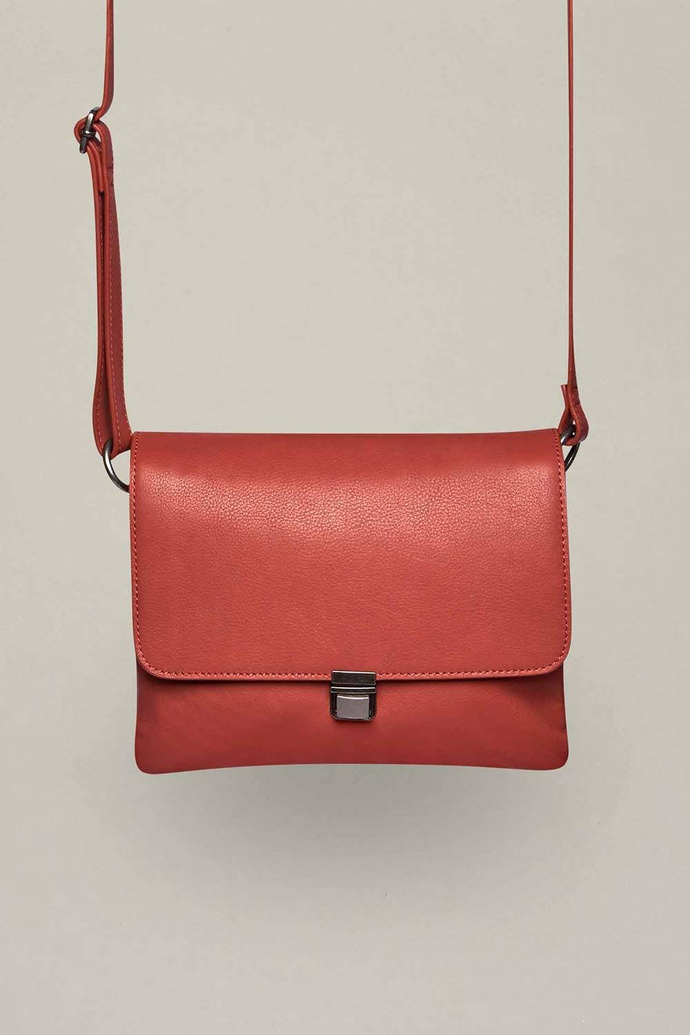 Stylish Moshulu 'Budburst' ladies' bag in dark red leather. Its sleek design features a long, adjustable strap for versatile wear. The bag includes a clip-fastening clasp for security and interior pockets for organization.