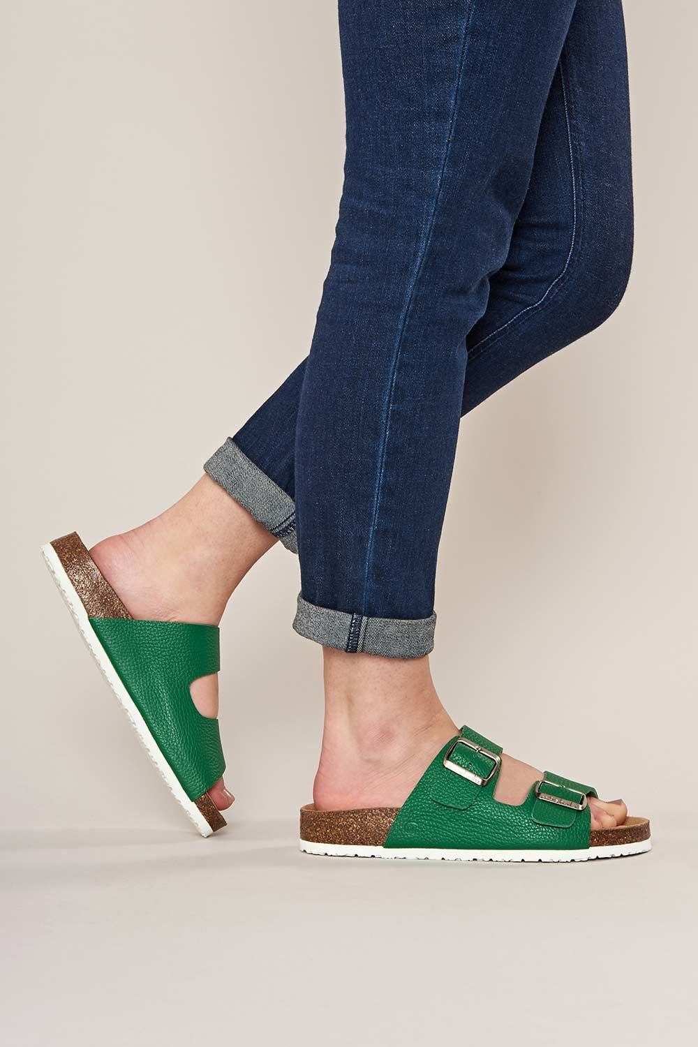 Vibrant emerald green sandals with a cork footbed for comfort. Featuring soft leather straps and a double buckle closure, these sandals are perfect for summer strolls.