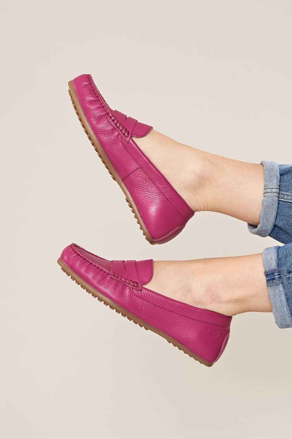 Timeless fuchsia leather moccasin loafers with a soft unlined interior. Lightweight, breathable, and elegant. Features a hidden wedge, cushioned footbed, and flexible rubber sole for all-day comfort.